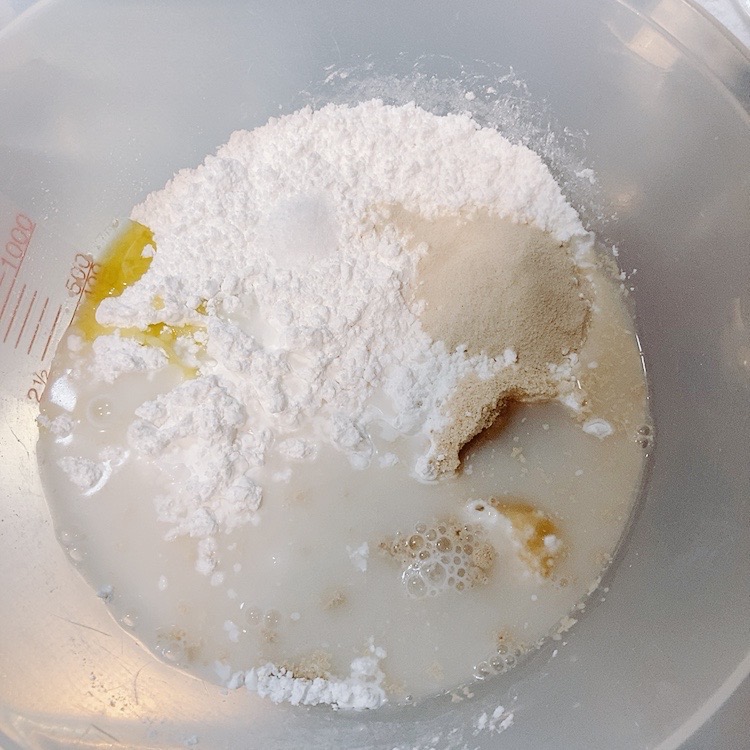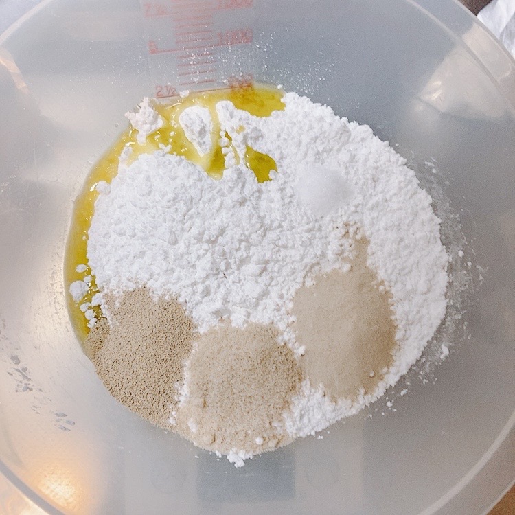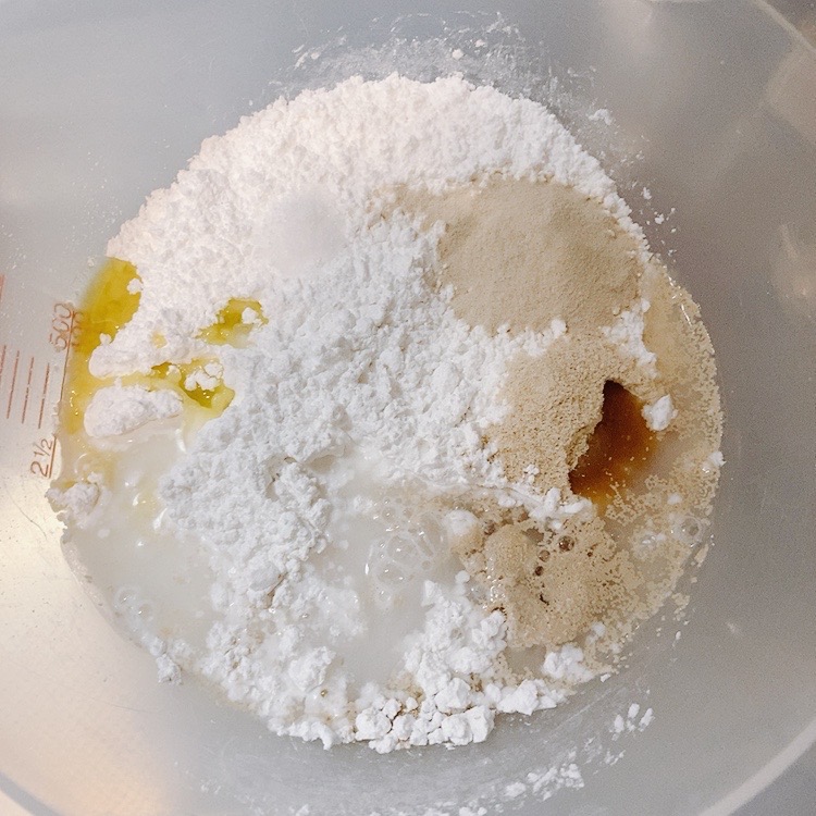 - ボールに米粉、砂糖、サイリウム、酵母(ドライイースト)、塩、オリーブオイルを入れる。