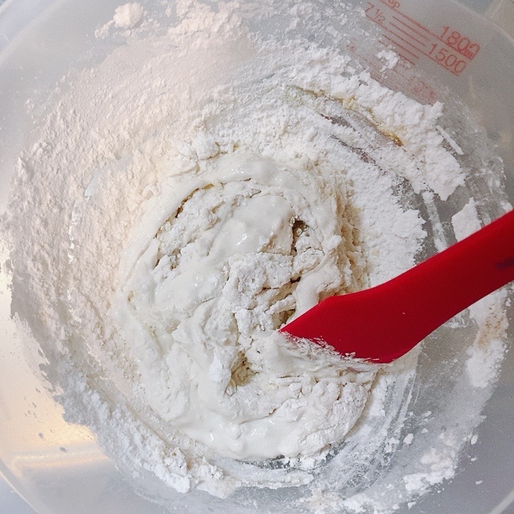 - 酵母をめがけて水2/3を加え、ゴムべらでよく混ぜる。