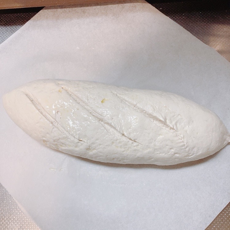 - ハケで全体にオリーブオイル(分量外)を薄く塗り、クープを3箇所入れる。