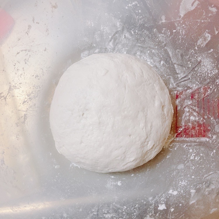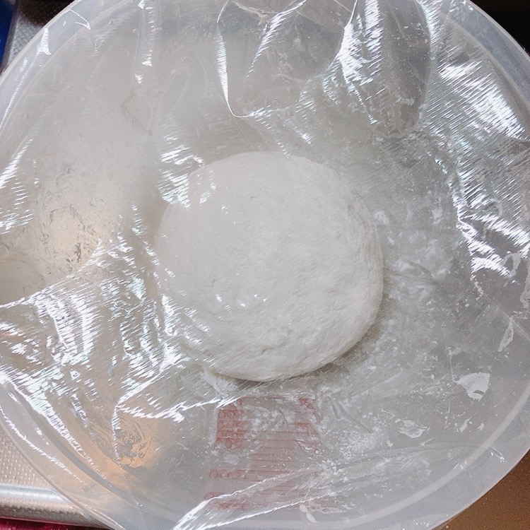 - ボールの中で生地をひとまとめにして上からラップをかけ、40℃のオーブンで20分発酵させる。