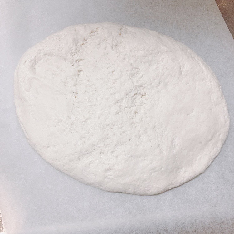 - クッキングシートの上で、生地を手で縦10cm横20cmくらいの楕円形に伸ばす。