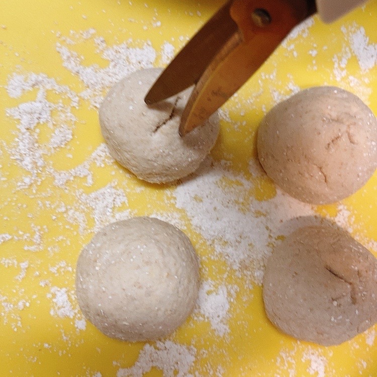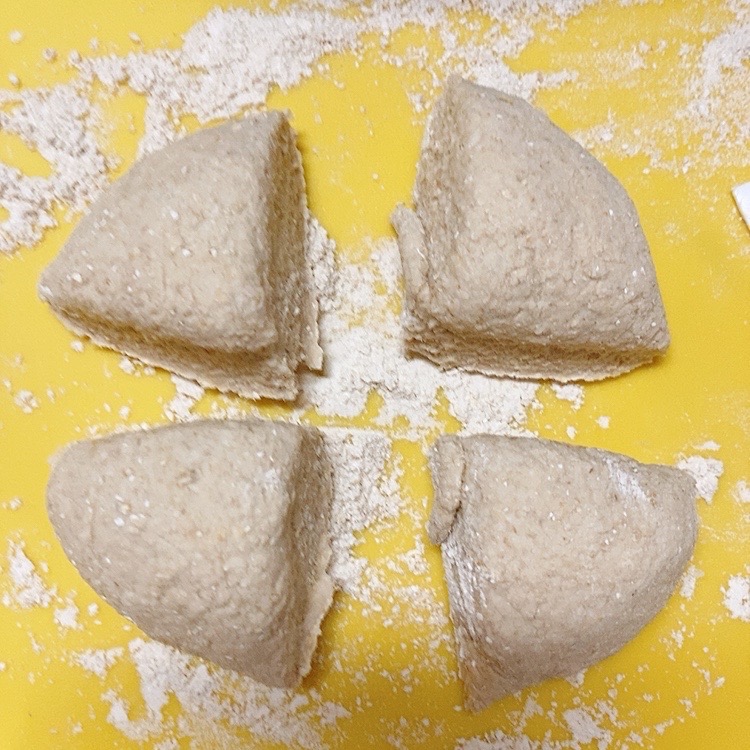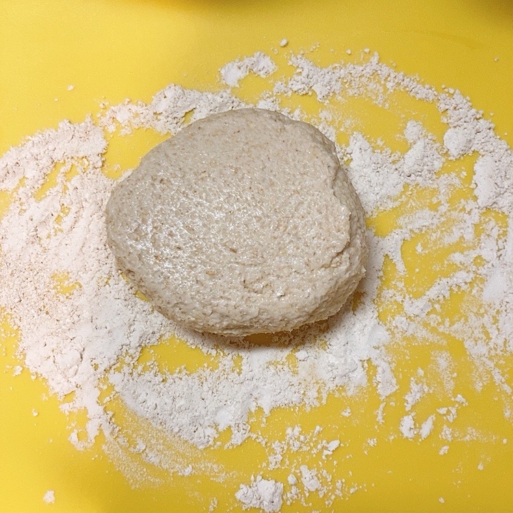 4. 分けておいたオートミールの打ち粉を台にまぶして生地を広げ、手に米油を少量つけて4等分にして丸める。
