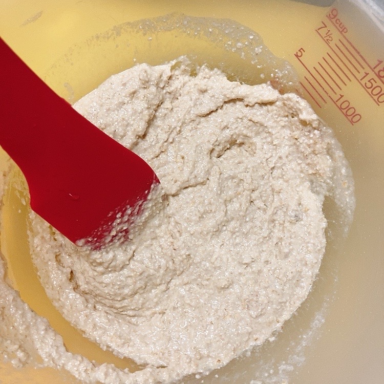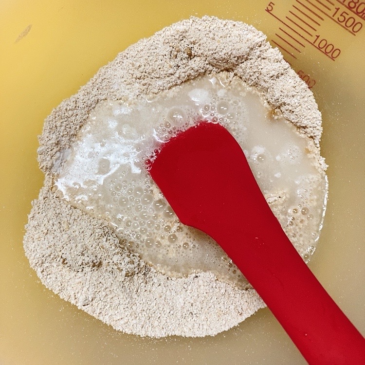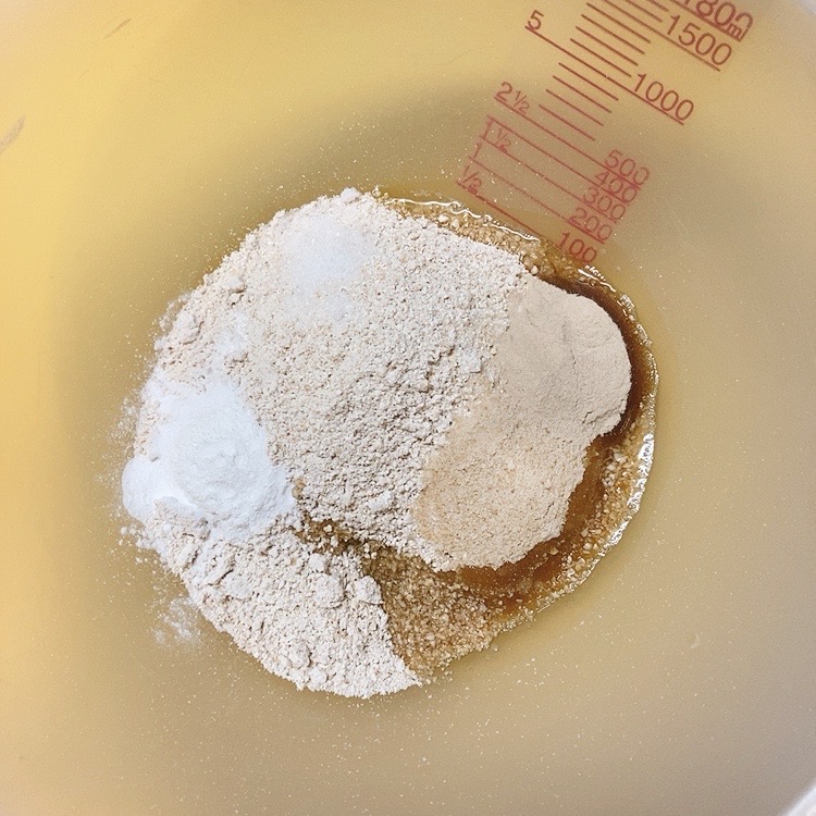 1. ボウルにオートミール、きび砂糖、塩、ベーキングパウダー、サイリウム、米油を入れ、水を少しずつ加えてよく混ぜる。