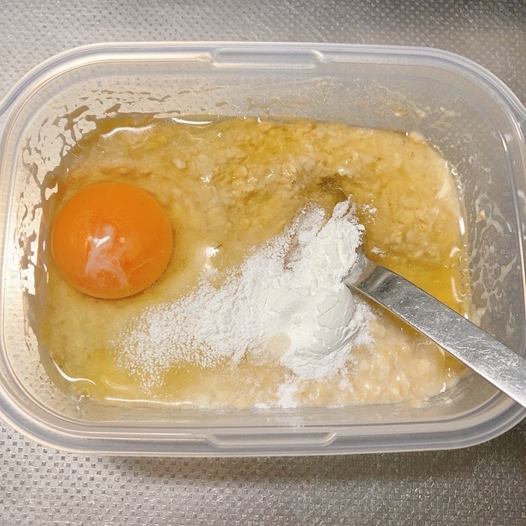 2. バナナをつぶしていれ、卵、はちみつ、ベーキングパウダーも加えて混ぜる。