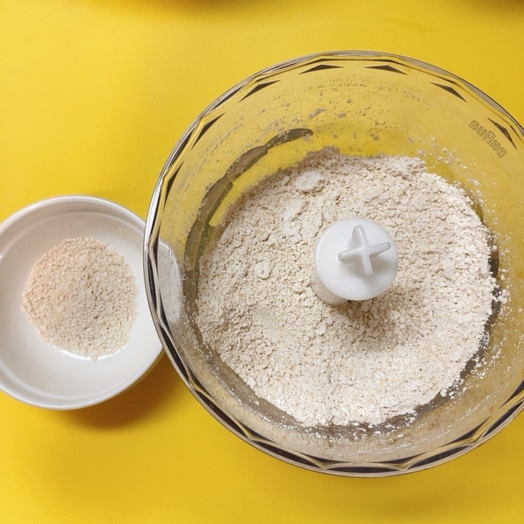 オートミールはフードプロセッサーで粉砕する。成型すると際の打ち粉を、5g目安で別で分けておく。