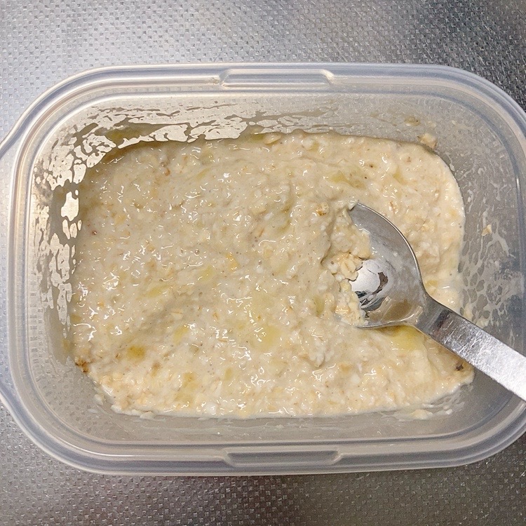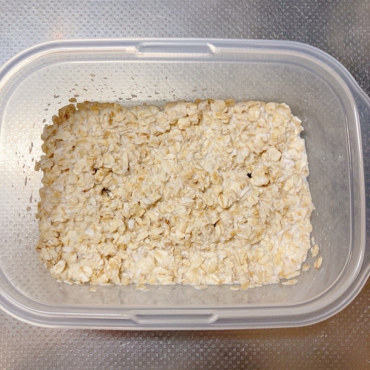 1. 400m程度lのタッパーに牛乳とオートミールを入れて5分ほどおき、潰すようによく混ぜる。